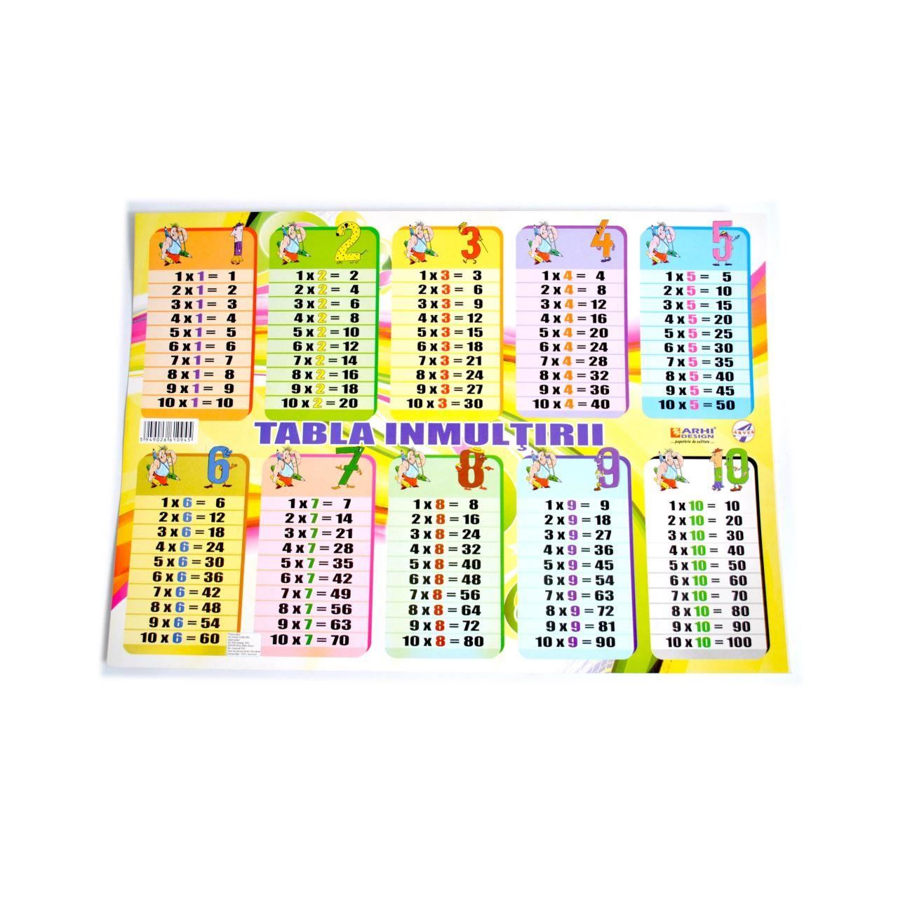 Plansa tabla inmultirii din carton, lacuire UV, destinata scolarilor si prescolarilor.